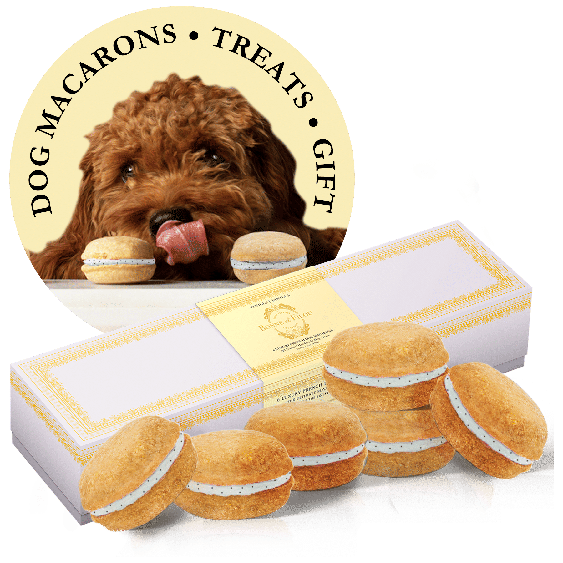 Dog Macarons - Count of 6 (Dog Treats | Dog Gifts)This box of our premium macaron treats features: - Box of 6 dog macarons- Handmade with premium human-grade ingredients in the USA- 100% natural; corn-free; wheat-free ingredients- No artificial coloring or preservatives- Hard treat designed for a long-lasting chew- Shelf life of 12+ months | No need for refrigerationBase Recipe Ingredients: Oat Flour; Honey; Coconut Oil; All-Natural Flavored Yogurt FillingFeeding Instructions:Our treats are hard; designed for a long-lasting chew. For elderly or small dogs; we recommend breaking the treat in smaller pieces (by twisting both sides).