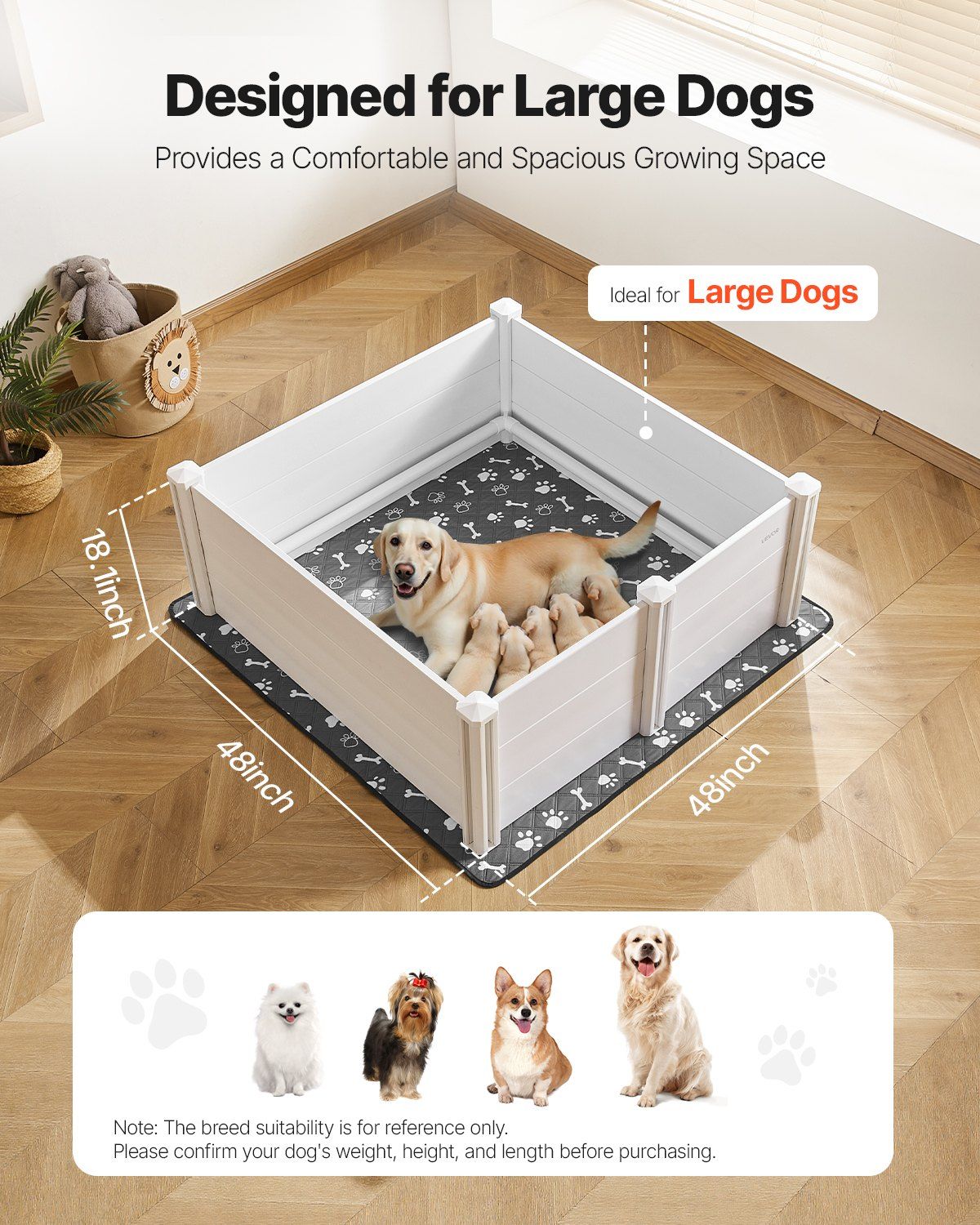 1.Whelping Box for Large Dogs: Sized at 48x48x18.1 inch / 1220x1220x460 mm, our dog whelping box offers a spacious and comfortable area for large dogs, ensuring plenty of room for movement. Please CONFIRM your dog's weight, height, and length before purchasing